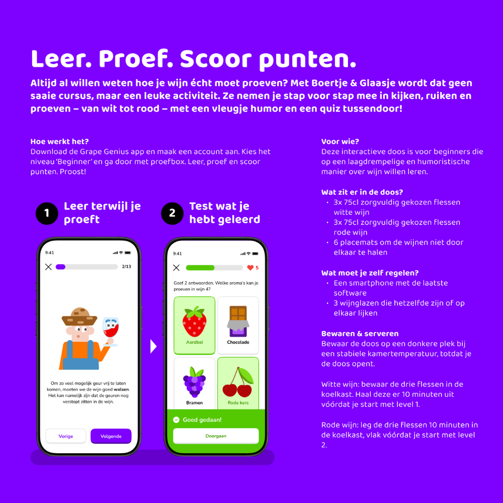 Met de Grape Genius Proefbox beleef je wijn op een manier die speels én leerzaam is. Deze unieke proefervaring voor 2 tot 6 personen combineert proeven, leren en plezier in één avond van 1 tot 2 uur. Via de gratis Grape Genius app volg je korte, humoristische lessen en quizjes die wijn ineens verrassend begrijpelijk maken.